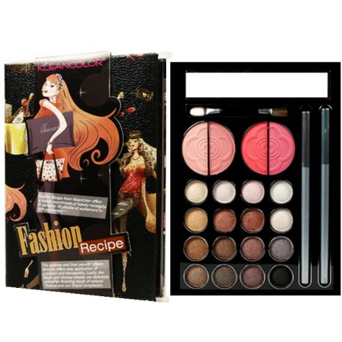 Fashion Recipe from KleanColor offers a classic assortment of beauty necessity. It contains 16 shades of excitement in rich pigments. The eyebrow and liner pencils cream formula offers easy application of precision and blendability. Lastly, the blush and bronzer shades are delicately paired for finishing touch of natural flushed and sun-kissed complexion. This set contains: 1 x built-in mirror 1 x eyebrow pencil 1 x liner pencil 1 x duo applicator 4 x bronzers & blushers 16 x eyeshadows Net Wt. Eyeshadow 11.2 g / 0.40 ozBlush and Bronzer 8 g / 0.28 ozEyebrow and Eyeliner Pencil 2.4 g / 0.08 oz