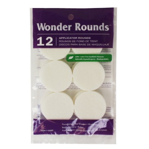 WONDER ROUNDS ARE OF THE HIGHEST QUALITY MATERIAL. >12 Piece package>Great for application and blending of cream and liquid make-up>Great for applying powder make-up too>Our professional quality rounds are made in the USA>100% Latex Free, Naturally Hypoallergenic, Anti Bacterial and Biodegradable.>They will not flake, crumble or yellow and they retain their exact shape if crushed during shipping>Can be used with your favorite soap and make-up remover>Wonder Rounds are so economical, you can enjoy using a clean, fresh round as often as you like